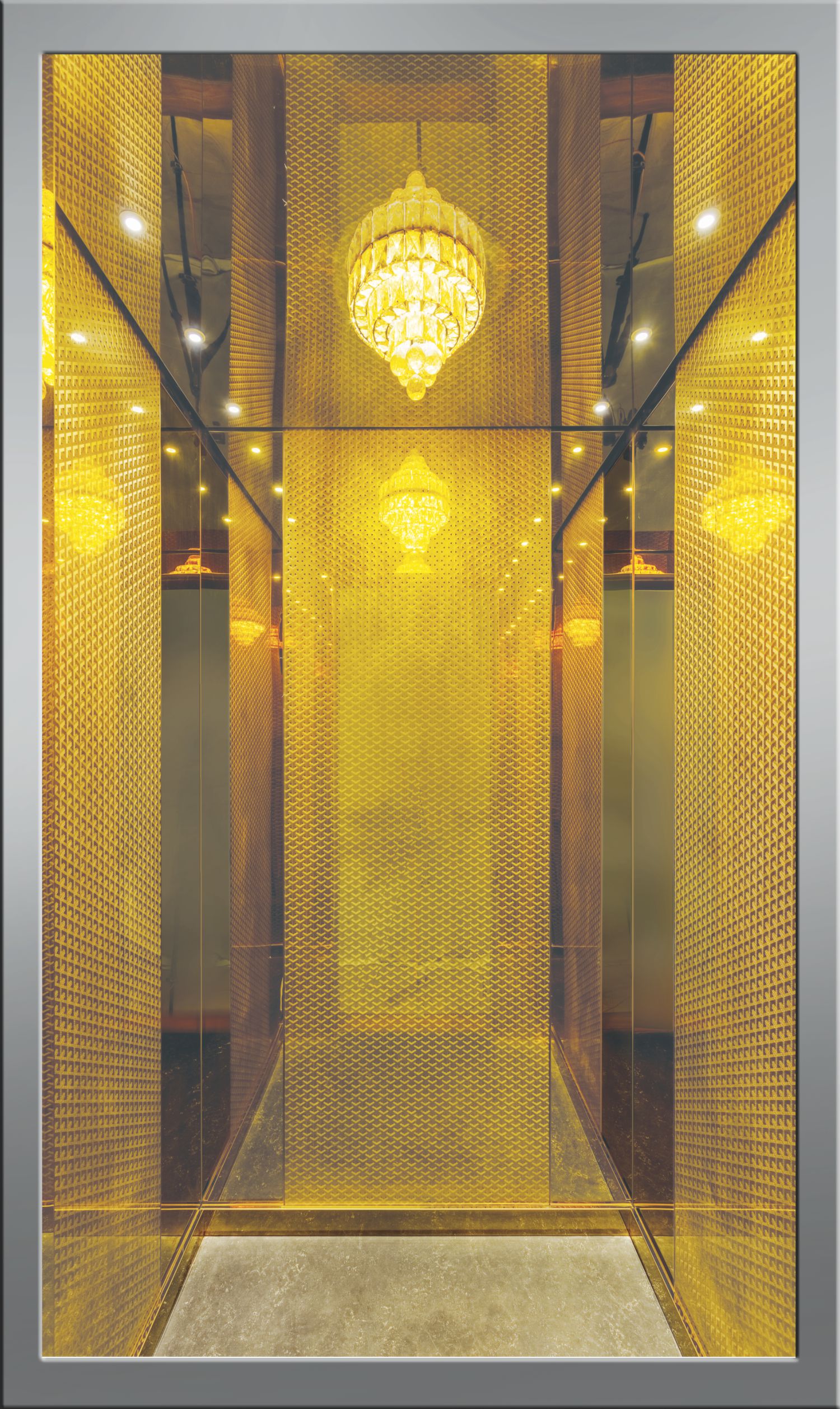 Premium Range CAB - M01 Center Panels SS Gold Etching Corner PanelsSS Gold Mirror SkirtingSS Gold Mirror Suspended CeilingSS Gold Mirror with LED Spot Light with Chandelier CAB - M02 Center Panels Black Pre Coated Design Corner PanelsSS Black Mirror SkirtingSS Mirror Suspended CeilingSS Mirror with LED Spot Light CAB - M03 Rear Wall SS Nickel Hairline Side WallsSS Nickel Hairline SkirtingSS Nickel Mirror Suspended CeilingSS Nickel Hairline with LED Spot Light